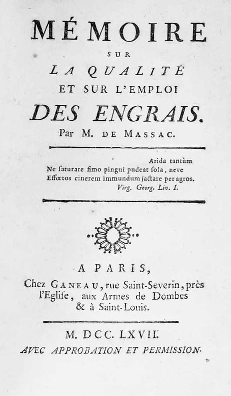 Première édition.Les sociétés d'agriculture furent créées dans toutes les généralités entre 1760 et 1769. Elles étaient chargées de faire progresser cette branche, "la plus utile à l'économie nationale". Dans cette perspective, Massac (1728-1770) dresse un panorama des connaissances des "nourritures artificielles" de la terre. Il distingue celles provenant du règne animal (les fientes et les matières stercoraires), celles du règne végétal (les écorces, les branches et feuilles d'arbres) et celles du règne minéral (les coquillages, la marne, les cendres). Le propos de l'auteur était d'offrir aux paysans cultivateurs un livre clair et précis. Son travail fut couronné par la Société d'agriculture de Berne.Cioranescu, XVIII, 43461. Quérard, V, 596. Pas dans INED. - - VENTE PAR CORRESPONDANCE UNIQUEMENT - LIEN DE PAIEMENT, NOUS CONSULTER.