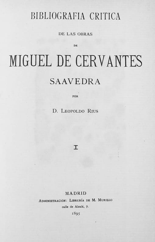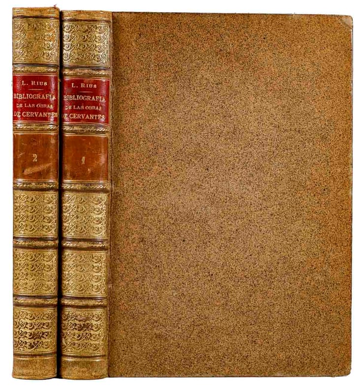 Madrid, M Murillo, 1895, 1899, gr. in-8vo, (25.7x18 cm) frontispice ‘Busto de Cervantes’ + VIII + 402 p. + 1 ff. / 2 ff. + 380 p. + 2 ff., (con 1926 entradas bibl.), reliure en cuir originale. Dos richement orné or. Bel exemplaire.