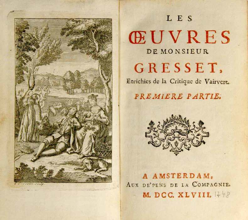 Amsterdam, Aux dépens de la compagnie 1748, in-8vo, frontispice gravé de Cotin + 144 + 136 + 146 + 56 + 52 pages + 5 titres en rouge & noir, reliure en veau d’époque. Coiffe sup. tirée, sans manque tranches rouges. Bel exemplaire