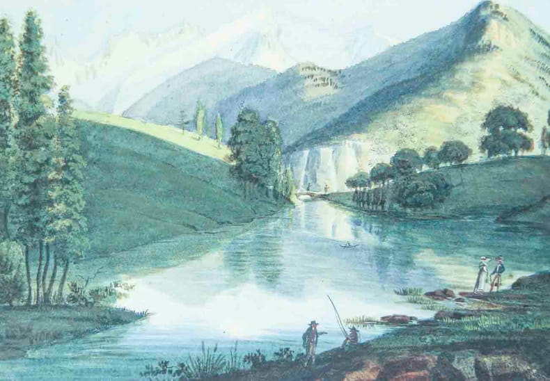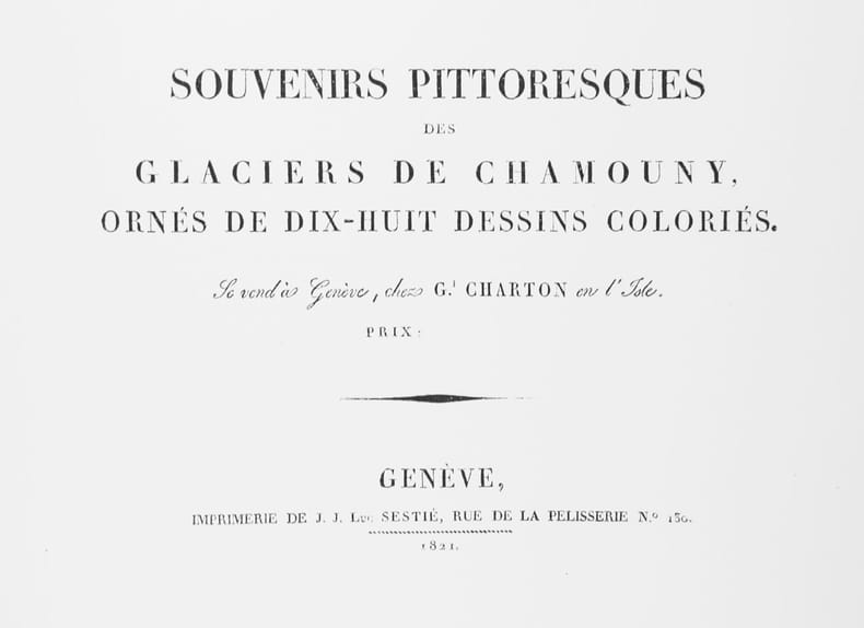 Très rare en édition originale (peu d’exemplaires connus), c’est dire tout l’intérêt de cette luxueuse réimpression que Tony Astill nous donne aujourd’hui, et qui devrait pleinement satisfaire les amateurs qui auront le privilège de la compter dans leur bibliothèque (Jacques Perret).Les planches; Vue de Genève / Genève et le Mont Blanc / Bonneville / Saint-Martin / St. Gervais / le Lac de Chède / Servoz / Glacier des Bossons ou Buissons / le Prieuré / le Montanvert / le Glacier des Bois / la Source de l’Arveron / la Grotte du Chapeau / le Col de Balme / Voyage de Mr. de Saussure et de son Fils au Col du Géant / Idem : Descente de Saussure / Voyage au Mont-Blanc.