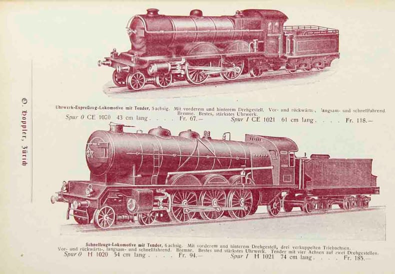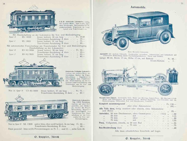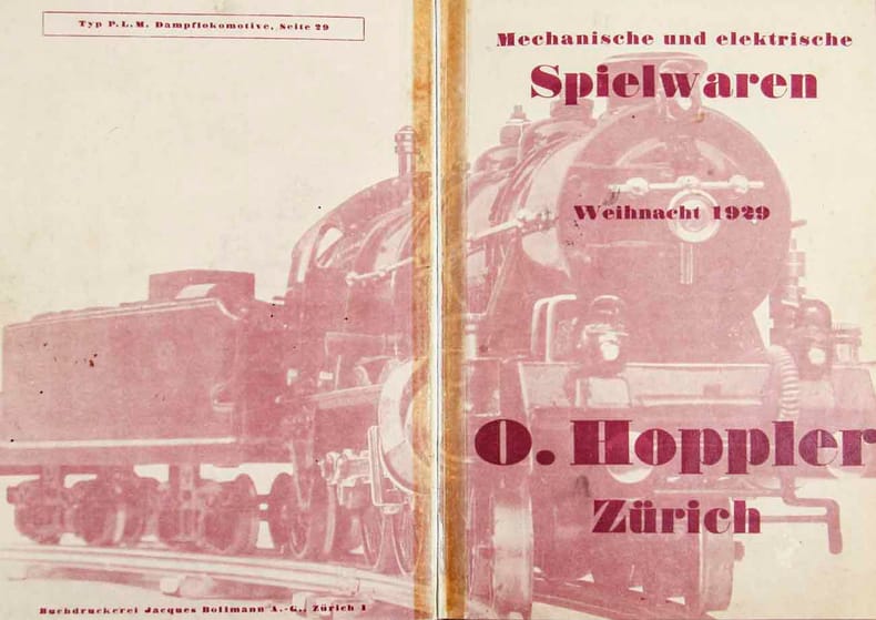 1924 - 1947, in-8vo, Sammlung von 6 reich illustreirte Katalogen der Fa. O. Hoppler Zürich mechanische u. elektrische Spielwaren. Ausgaben Weihnachten 1924, 1926, 1928 u. 1946 (G. Feucht Nachf. von O.Hoppler Zürich). + 1 gef. ill. Farbtafel - Märklin Sprint die schnelle Autorennbahn für die Familie -. illustrierte Original-Broschüren. + 1929 u. 1934 in priv. Einband.