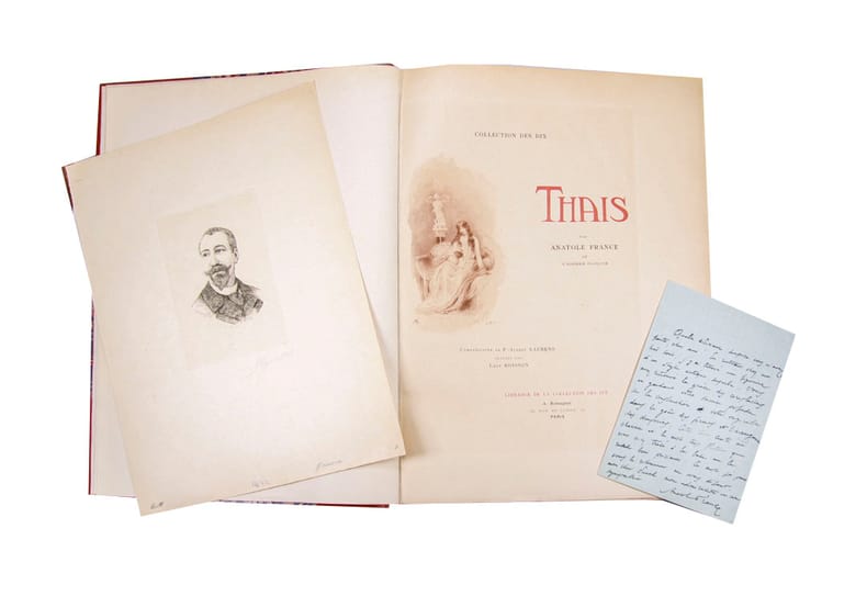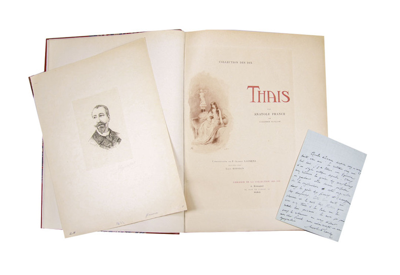 Superbe exemplaire à grandes marges, non rognées, enrichi d’une aquarelle originale signée de Laurens, d'un portrait signé par l'artiste et une LAS (Lettre Autographe Signée) de Anatole France ainsi que de deux illustrations sur japon. Exemplaire entièrement monté sur onglets dans une charmante reliure signée Émile Adolphe Carayon (1843-1909). Relieur à Paris, „ses reliures impeccables de façon faisaient toujours l’admiration des connaisseurs dans les expositions“. (Fléty). Petit ex-libris au chiffre G:B. au contre-plat. Monod 4958; Carteret Le trésor du bibliphile ((1948) p. 170: Belle publication cotée, surtout en grand papier. image disp.