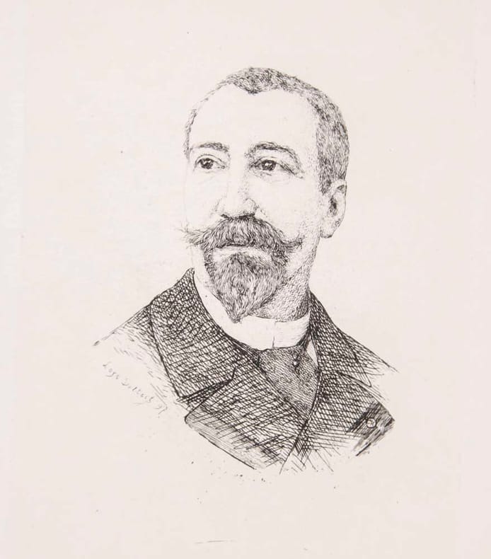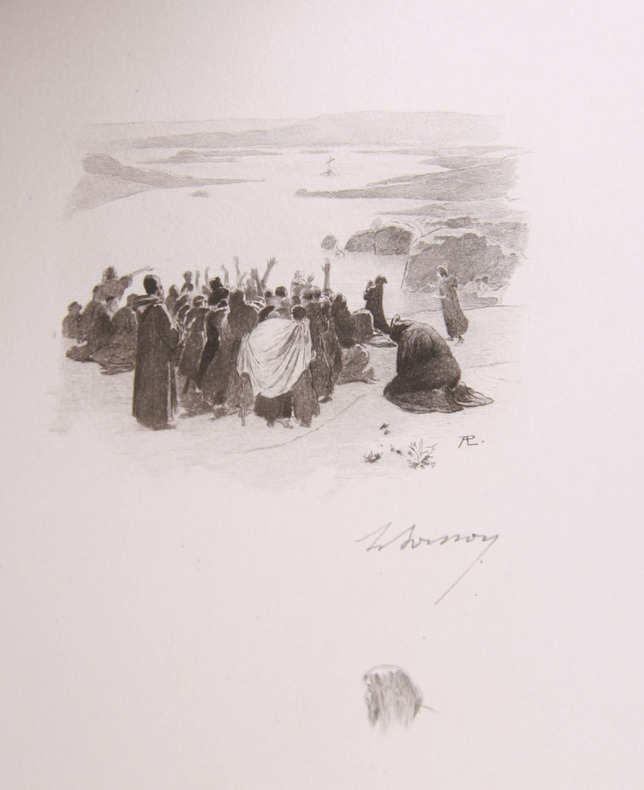Paris, Librairie de la Collection des Dix, A. Romagnol, (Imprimé par Charles Hérissey Imprimeur typographe / A. Porcabeuf, impr. en taille-douce), 1900, in-folio, (35x27 cm.), 2 ff. + 240 p + 1 f. + 2 ff. Orné de 65 gravures à l’eau-forte par Léon Boisson d’après Paul-Aubert Laurens, dont 7 à pleine page + le catalogue annonçant ce titre „petit in 8“, Tirage limité à 105 ex., (20 japon et 40 chine ou vélin à la cuve & 45 véin d’Arches) celui-ci sur vélin de cuve avec 3 états des illustrations et 2 états des vignettes (dont une signée par le graveur), ex. sur grand papier, reliés demi-maroquin rouge cerise à coins, dos lisses ornés, dorés et mosaïqués de colonnes et palmettes de style égyptien, filet doré aux plats couvertures et dos conservés. Reliure signée Carayon. (Fléty p. 38).