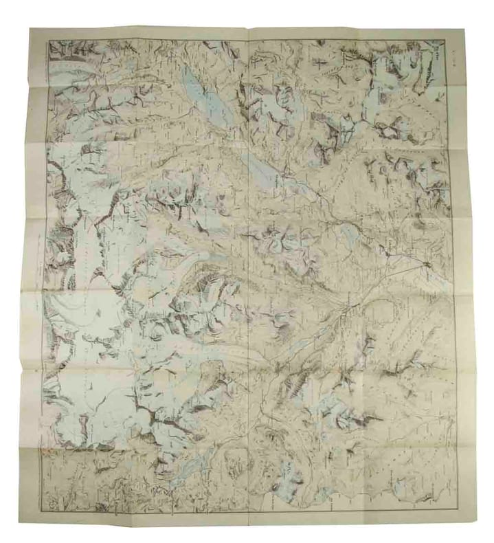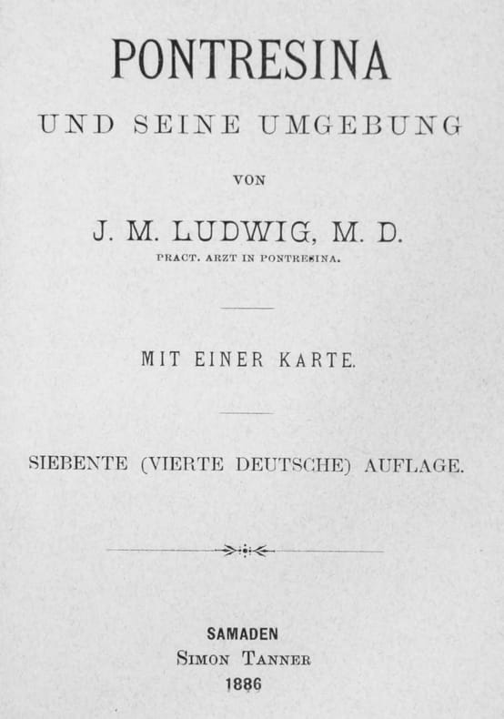 Samedan, simon Tanner 1886, kl. in-8vo, VII + 1 S. leer + 146 S. + 1 Bl. leer + 1 mehrfach gefaltete Karte (53 x60 cm.), Stempel ‘L. Diezinger’ auf Vorsatzbl., Original-Pappband. Titel auf Rücken u. Umschlag-Vorne.