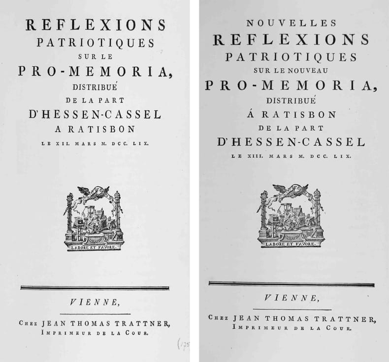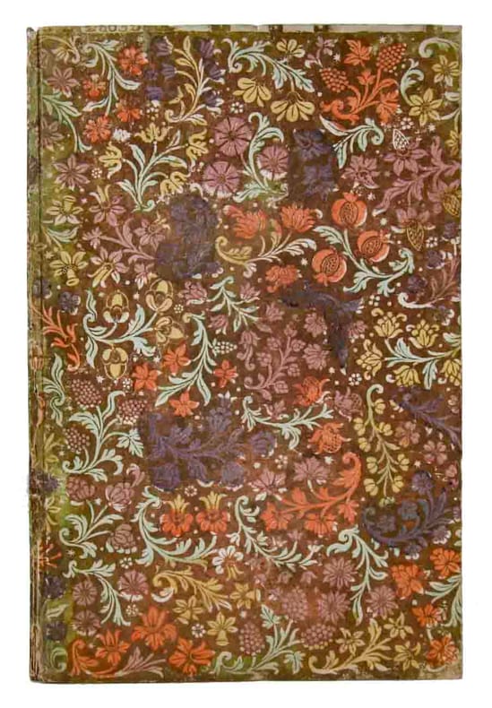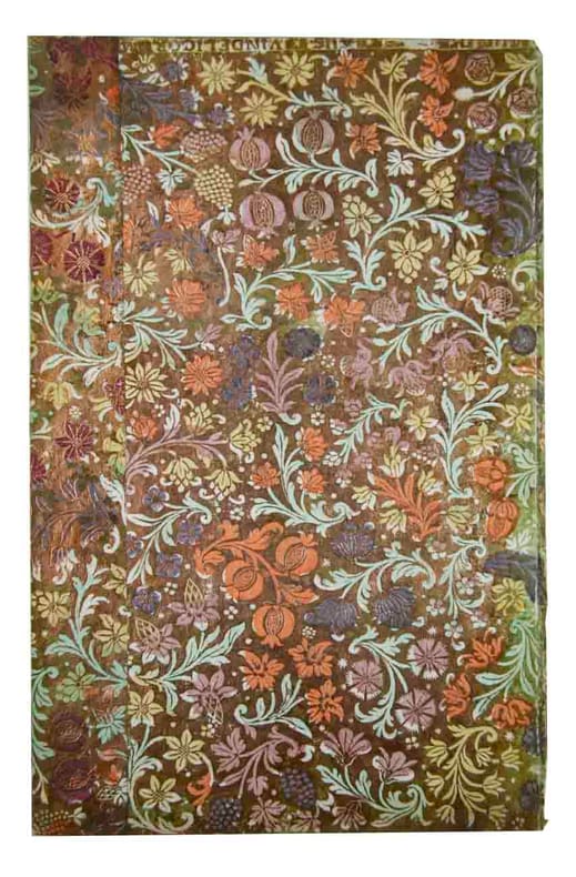 Vienne, Chez Jean Thomas Trattner, Imprimeur de la Cour, 1759, in-4to, (32x20 cm), 26 S. (inkl. 2 Titelbl. mit wiederh. gest. Vignette), (Augsburger Brokatpapier). Interimseinband mit Brokatpapier auf Karton in Farbe und Gold / Brocade paper over board covers with multiple colorfull design in gold, green, blue & orange. (on top of second cover: ....manufacturn’s name not readeble. + AUG. VINDELICORUM). A very fine sample of this kind of luxury paper.