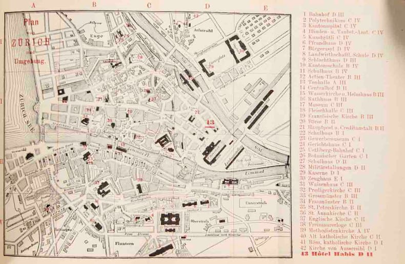 Zürich ,J.R. Müller, 1883, kl. in-8vo, 48 S., (S. 35 bis 48 ill. Werbung) + gef. Plan vonZürich und Umgebung, reich illustriert, Ex Libris Peter E. Obergfell, illustrierte Original-Broschüre.
