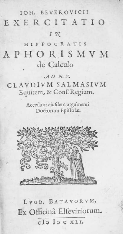 Rare first Elzevir edition of this epistolary essay by Jan van Beverwijck in which he argues against Claude Saumaise's interpretation of Hippocrates aphorism about urinary stones, the subject of van Beverwijck's thesis when graduating in Padua. Image disp.
