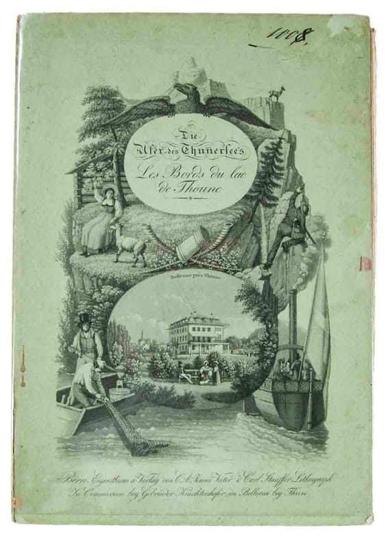 Panoram des Thunersees, quergeteilt und von oben wie von unten zu betrachten. Die schönen Ansichten sind gestochen von Johannes Ruf. nach Franz Schmid. In Kommission bei den Gebrüdern Knechtenhofer, die das auf den Einbanddeckeln abgebildete Hotel Bellevue betrieben und 1835 mit dem Schiff Bellevie die Dampfschiffahrt auf dem Thunersee begannen: Karte mit 1837 im See durchgeführten Tiefenmessungen. Das Dampfschiff ist auch auf der Ansicht von Thun im vorderen Innendeckel zu sehen. Markus Krebser: Thun und seine Landschaft (2004), n° 412 (mit ganauen Angaben dieses spiegelbildlich dargestellten Panoramas). (Auch Umschlagbilder: n° 190, 291 & 189). Image disp.
