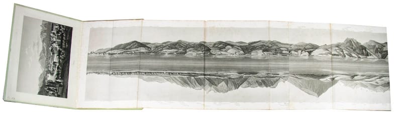 Bern, C.A. Jenni (Vater) & C. Stauffer, 1837, in-4to, (26.5x19 cm), Gefaltenes Aquatinta-Panorama, beide Seeufer spiegelbildlich dargestellt. Ausgefaltete Länge 22.5 x 117.2 cm, etwas stockfleckig, wenige ungenaue Falten im Panorama, Original-Pappbandmäppchen mit gest. Titel und 2 Aquatinta-Ansichten (Rück- u. vorderer Innnendeckel) sowie mit 1 lith. Karte (hinterer Innendeckel).
