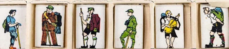 Mainz, Verlag Josseph Scholz, o.J. (1924). 31x34 cm (Kasten), 1Bl. r/v Spielregeln (braunfleckig durch Klebstzreifen), 1 gef. grosser farbiger Spielplan + 6 farb. Pappfiguren (je 2 x 3.5 cm.) + 1 Farbenwürfel, (fehlen 1 zahlenwürfel & 1 säckchen mit Spielmarken), illustrierte O.-Schachtel.