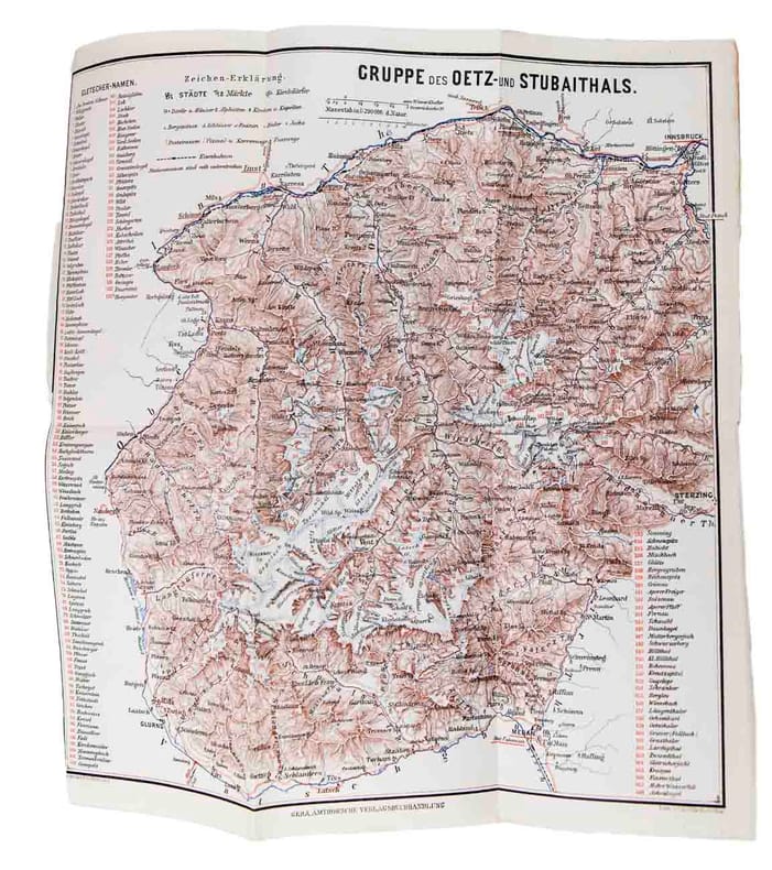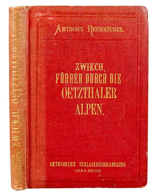 Gera, Leipzig u.a. Amthor, 1885, kl. in-8vo, VIII + 227 S. + 56 + 1 Tafel ,Routennetz’ + 4 Faltkarten: 1) hinteres Oetzthal./ 2) Die Arlbergbahn u. Arlbergstrasse. /3) S. Anzeiger für Touristen als Beilage auf farbiges Papier/ 4) Gruppe d. Oetz-und Stubaithals ./ + 4 (Doppelt-) Panoramas auf 2 gef. Tafen: 1) ,des Hohen Burgstall im Stubaithal’ 2 Theile auf 1 Blatt (Tirol), 2) ,Panorama des Eggessengrates’. + Panorama v. Habischt (kleinere einrissen ausgebessert), Stempel Alpen-Verein Section Jena / Original-Leinenband.