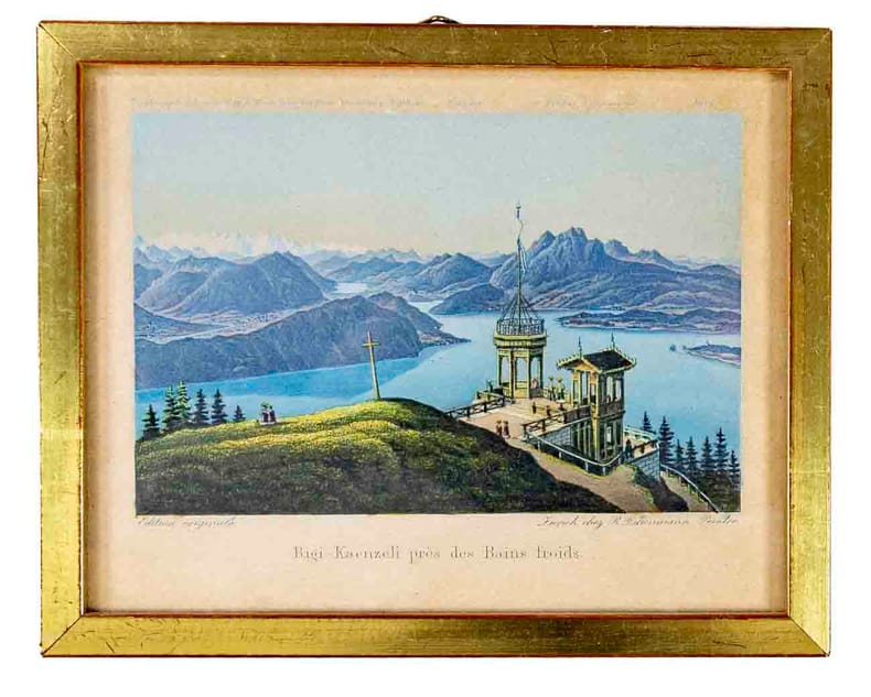 Zürich, R.Dikenmann, o.J. (um 1830), 10x13 cm., kolorierter Stahlstich mit Aussichtturm und Vierwaldst.-See. (Edition originale) in Goldrahmen. (11.5x14.5 cm).