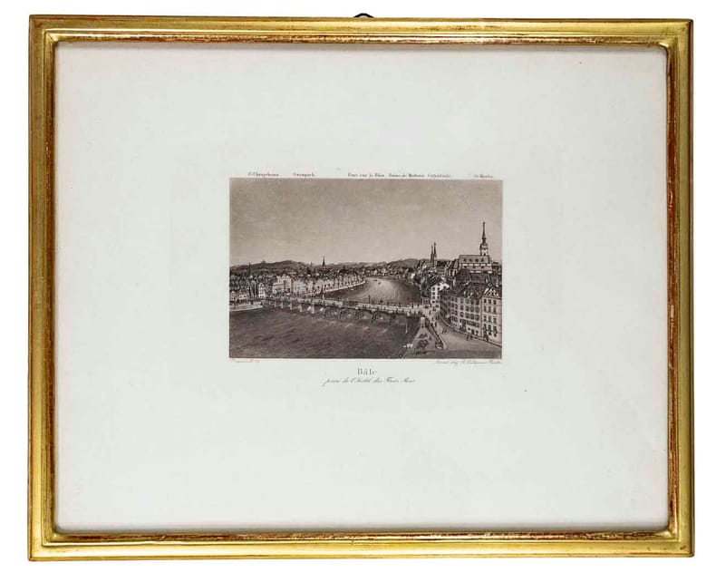 (Zürich), o.J. um 1840, 7.5 x 11 cm, (Ansicht) Aquatinta Radierung. (Original 193). Uebereck goldrahmen. Unter Glass und Passepartout gerahmt. (20x27cm).