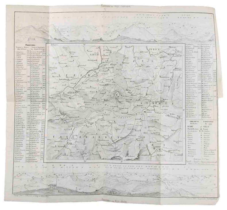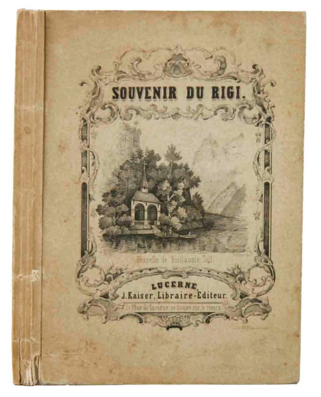 Lucerne, J. Kaiser, 1853, pt. in-8vo, titre + 122 p. + 1 f. bl. + 6 planches lithogr. de R. Wallis + 1 grande planche dépl. (avec 2 panoramas sur la même feuille) + 1 f. ‘tarif pour les porteurs d’effets’, ‘pour des porteurs de chaises à la montée’ et ‘pour les chevaux’, cartonnage original illustré. (devant ‘Chapelle de Guillaume Tell’ et au verso ‘Plan de Lucerne’ avec légendes et titre Souvenir du Rigi, bas du dos avec minime obstruction, sinon bel exemplaire.