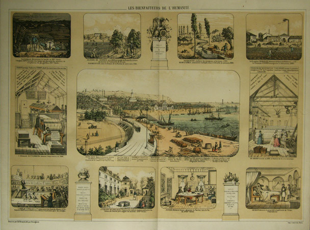 10 groupes d’images autour d’une grande image centrale. ‘ Denis Papin (Vapeur) , Kioja (boussole) Franklin (Paratonnere) Bertholet (moyen de conserv. de l’eau sur vaisseaux) Fresnel (Phares) Chappe (telegr. électri) lesmoulins a vent - Image disp.