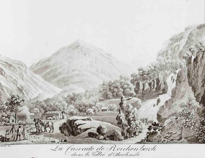 Magnifique tirage en sépia, rare, cet album pouvait, par la suite, être colorié par l’artiste. ‘Weibel sort des sentiers battus en éditant, vers les années 1807/08 son Voyage pittoresque...’, bien que cette modeste collection ait connu de beaux jours, principalement lors de la fête des armaillis de 1808 à Unspunnen... (Pittet).Les vues representent: Vue de la Ville de Berne - Village de Munsingen - Ville de Thoune - Environs de Thoune - Village de Hilterfingen au Lac de Thoune - Chateau de Spiez - Ville d’Unterseeven - Ruine d’Unspunnen - Cime de la Jungfrau dans la vallée de Lauterbrounen - Vue des Glacières du Grindelwald - Glacier de Schwarzwald sur le Mont Scheidek - Le Glacier de Roselauvi - Vallée d’Oberhasle - Cascade de Reichenbach - Vallée de l’Oberhasle prise Sur le mont Brunig - Village de Brienz - Cascade de Giesbach - Vue du Chateau de Ringgenberg au Lac de Brienz. Edouard Pittet, J.S. Weibel: page 82 et 217: N° 116 b ou c; cf. Lonchamp 3187; Perret - Image disp.