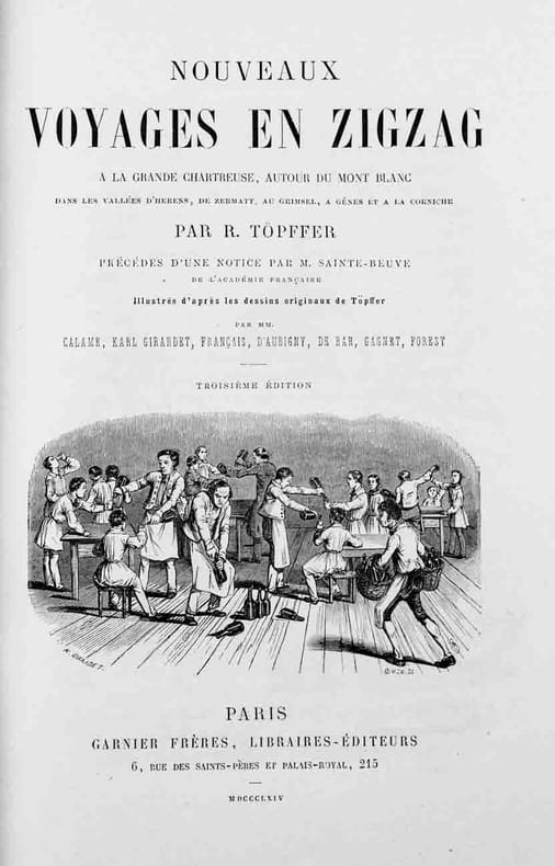 Récits des excursions à travers les Alpes d’une caravane guidée par Töpffer. Contient: ‘Voyage à la grande Chartreuse’ - ‘Voyage autour du Mont-Blanc’ - ‘Voyage à Gênes’. Superbe exemplaire dans un état exceptionnel. Ex. pour bibliophile averti. Perret 4297; Wäber 66, (plusieurs éditions). Image disp.