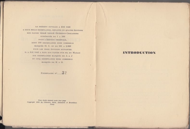 1929 P., Librairie Stock, 1929,In-12, br., non coupé, 254 pp. Edition originale tirée à 500 exemplaires numérotés sur vergé teinté,N°32; couverture defraichie avec petit manque en coin,texte frais.