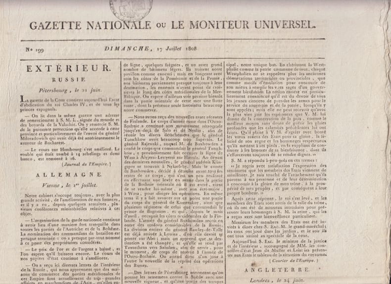 A la fois journal officiel de la France et journal classique offrant les dernières nouvelles et des articles sur divers sujets. Intéressant document pour servir à l'histoire de l'Empire. Remise de 20% pour toutes commandes supérieures à 200 €