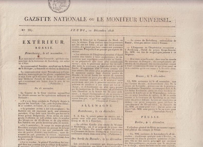 A la fois journal officiel de la France et journal classique offrant les dernières nouvelles et des articles sur divers sujets. Intéressant document pour servir à l'histoire de l'Empire. Remise de 20% pour toutes commandes supérieures à 200 €