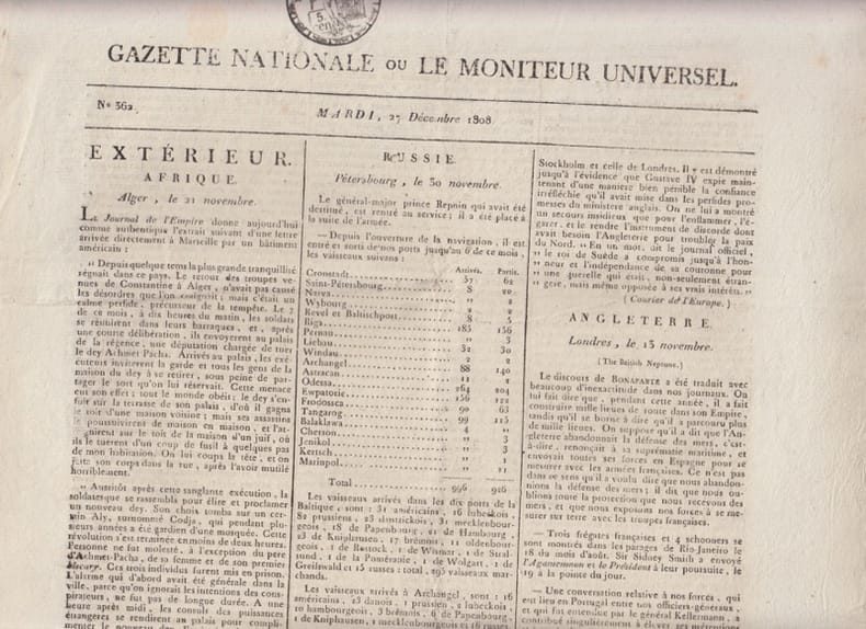 A la fois journal officiel de la France et journal classique offrant les dernières nouvelles et des articles sur divers sujets. Intéressant document pour servir à l'histoire de l'Empire. Remise de 20% pour toutes commandes supérieures à 200 €