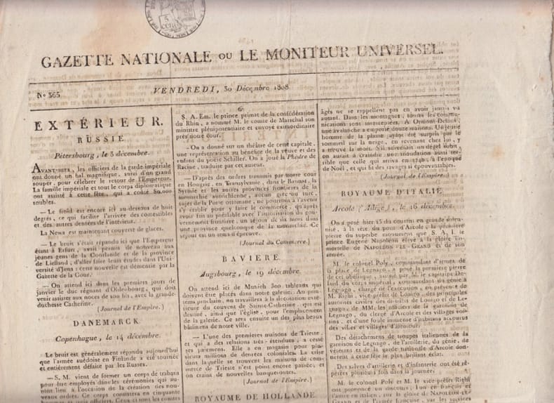 A la fois journal officiel de la France et journal classique offrant les dernières nouvelles et des articles sur divers sujets. Intéressant document pour servir à l'histoire de l'Empire. Remise de 20% pour toutes commandes supérieures à 200 €
