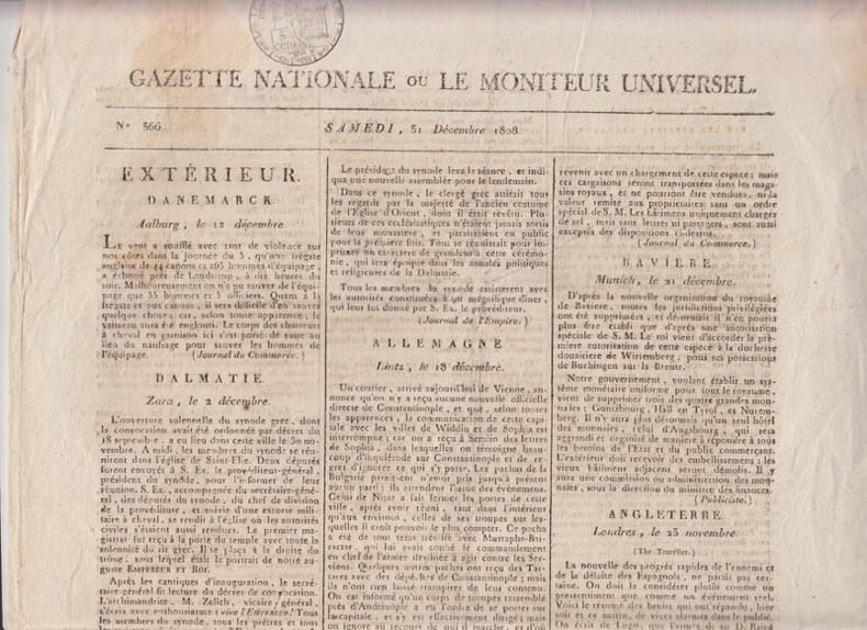 A la fois journal officiel de la France et journal classique offrant les dernières nouvelles et des articles sur divers sujets. Intéressant document pour servir à l'histoire de l'Empire. Remise de 20% pour toutes commandes supérieures à 200 €