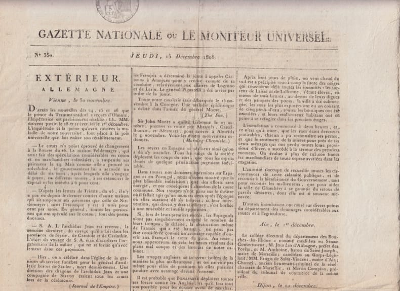 A la fois journal officiel de la France et journal classique offrant les dernières nouvelles et des articles sur divers sujets. Intéressant document pour servir à l'histoire de l'Empire. Remise de 20% pour toutes commandes supérieures à 200 €