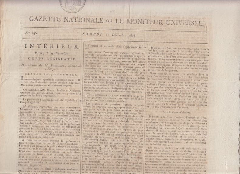 A la fois journal officiel de la France et journal classique offrant les dernières nouvelles et des articles sur divers sujets. Intéressant document pour servir à l'histoire de l'Empire. Remise de 20% pour toutes commandes supérieures à 200 €