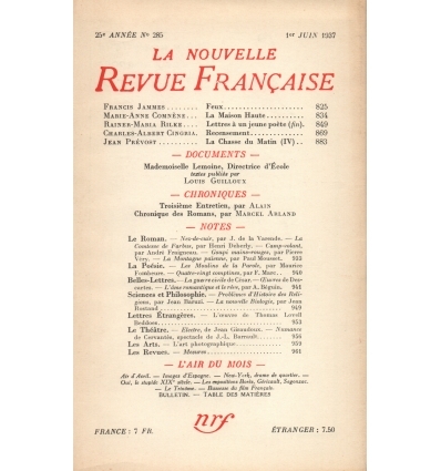La Nouvelle Revue Française , N° 285 -01/06/1937- 168 pages Francis Jammes, Marie-Anne Comnène, Rainer-Maria Rilke, Charles-Albert Cingria, Jean Prévost