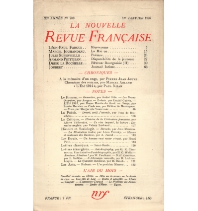 Gallimard, NRF Revue 1937 In-8 (14 x 22,5 cm), revue brochée, paginée de 6 à 160 ; pliure et deux petites déchirures au dos, rousseurs et traces aux plats, par ailleurs assez bon état général. Livraison a domicile (La Poste) ou en Mondial Relay sur simple demande.