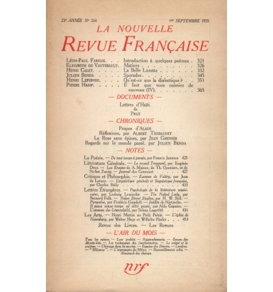 1935 LA NOUVELLE REVUE FRANÇAISE- Septembre 1935- N° 264 - 01/09/1935- 160 pages- Textes de : L. - P. Fargue ( Introduction à quelques poèmes ) ; Elisabeth de Vautibault ( Matines ) ; Henri Calet ( La Belle Lurette ) ; J. Benda ( Sporades ) ; Henri Lefebvre ( Qu ' est - ce que la dialectique ? ) .Il faut que vous naissiez de nouveau, par Pierre Hamp (IV). Lettres d'Haiti, de Prax. Réflexions, par Albert Thibaudet. La Rose sans épines, par Jean Grenier. Regards sur le monde passé, par Julien Benda