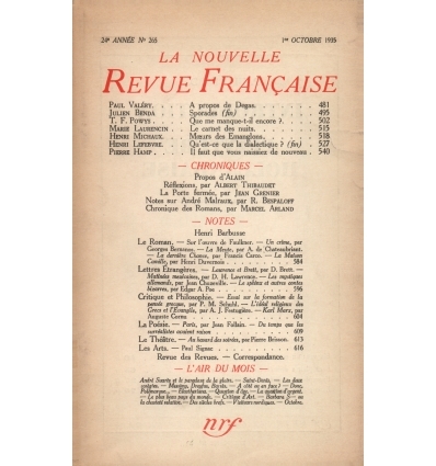 La Nouvelle Revue Française , N° 265 - 01/10/1935- 160 pages. Textes de : P. Valéry ( A propos de Degas ) ; Marie Laurencin ( Le carnet des nuits ) ; Henri Michaux ( Moeurs des Emanglons ) etc .