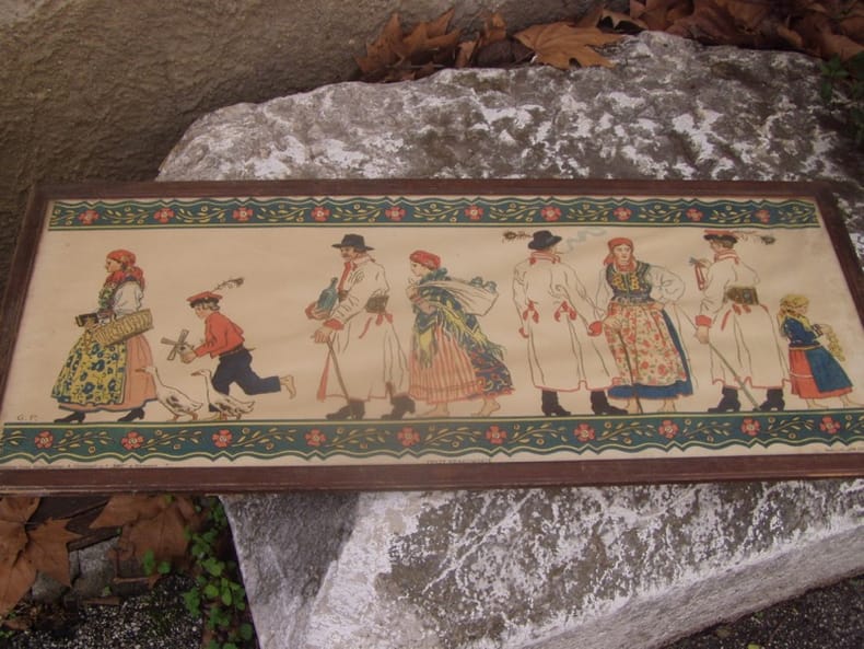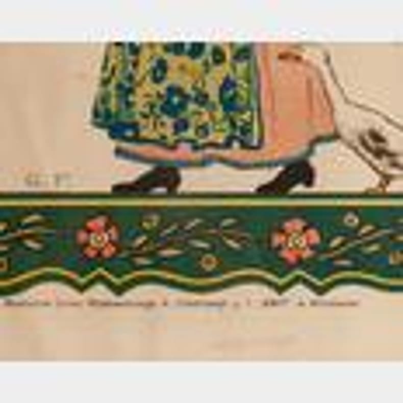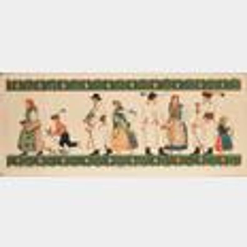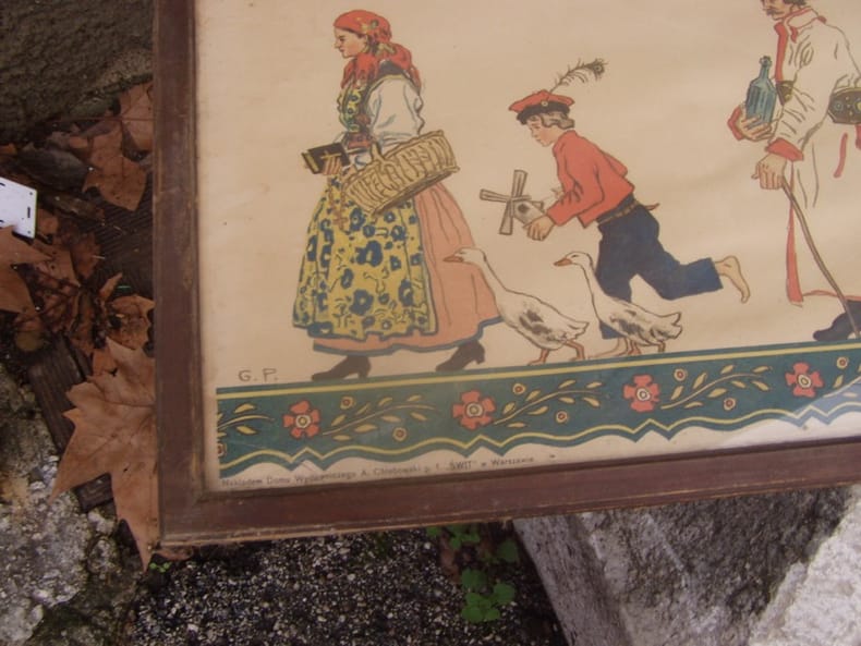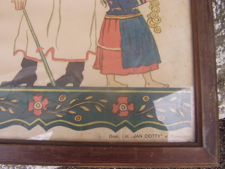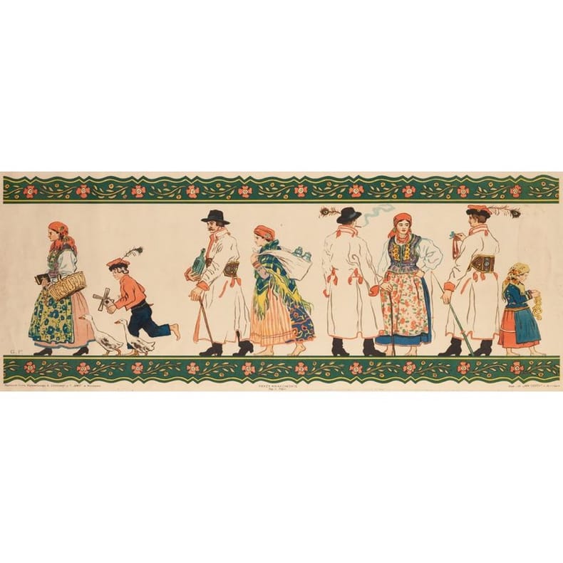 Cracow Friezes coloured lithography/paper, 35.5 x 83.5 cm ; printed at Jan Cotta print shop in Warsaw,Graphismes signés "G.P." L'auteur de la composition est Gustaw Pillati (1874-1931), peintre et illustrateur, issu d'une célèbre famille d'artistes de Varsovie. Il a étudié à Varsovie (avec W. Gerson), à l'Académie de Cracovie, à Paris et à Munich. Lié à Varsovie, il peint principalement des paysages et des types populaires (principalement de Podhale, de la région de Hutsul, de Haute-Silésie et de Łowicz). Publié par la maison d'édition. Remise de 20% pour toutes commandes égales ou supérieures à 200 €