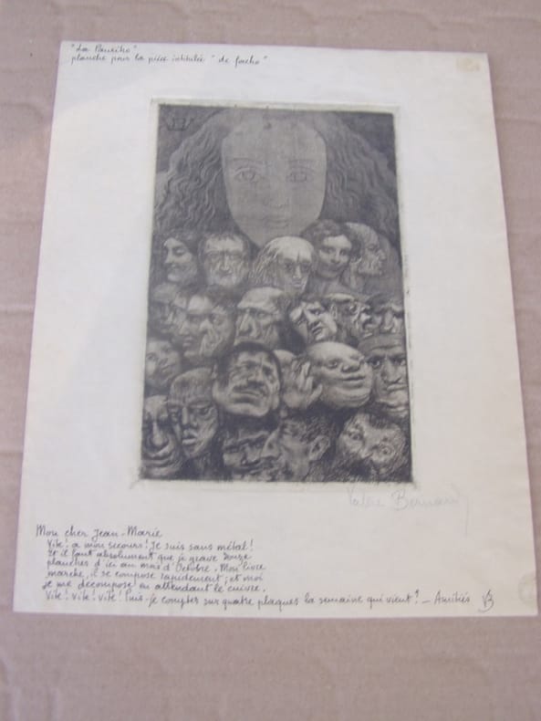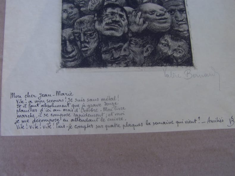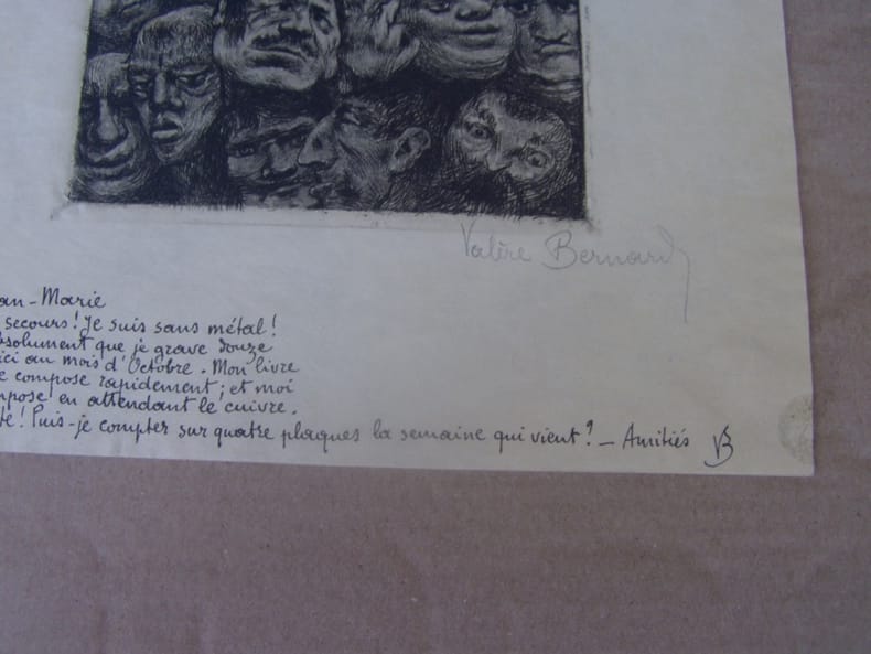 Ces planches exceptionnelles proviennent de la collection de son ami Chambon.- La Pauriho est un ouvrage paru en 1899, né de la volonté de trois ouvriers typographes du journal marseillais « Le Bavard » désireux de rassembler les poèmes que Valère Bernard avait publiés dans cette revue. Les traductions françaises, faites par Valère Bernard lui-même, ont été rajoutées à ce recueil et la préface est signée par Frédéric Mistral. Ce dernier souligne la noirceur générale des poèmes de cet ouvrage, où sont décrits les bas-fonds de Marseille. Le terme « Pauriho / paurilha » désigne d'ailleurs en occitan les pauvres gens.Le recueil est divisé en trois grandes parties (Pauriho, Paurugno, Pauraio) qui correspondent à une tentative de classification de l'humanité en souffrance : de la misère honorable à la déchéance humaine.Le talent de Valère Bernard s'exprime particulièrement dans les gravures, caractéristiques de son art, qui accompagnent les poésies. Leurs thèmes évoquent la misère, la mort et l'errance.En 1896, sa rencontre avec Félicien Rops influence à la fois sa gravure et ses thèmes. Il se lie d'amitié avec Alfons Mucha, qui lui fait découvrir l'affiche lithographique . De retour à Marseille, lors de ses premières expositions, la critique salue son talent tant dans ses eaux-fortes que dans sa peinture. Il livre entre autres une suite gravée intitulée Guerro (1893-1895), variations autour du thème de la mort, d'une grande intensité graphique, inspirée de Francisco de Goya. Remise de 20% pour toutes commandes égales ou supérieures à 200 €