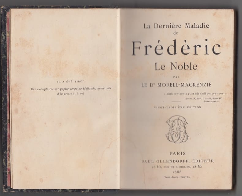 Paris, Paul Ollendorff, 1888, in-8, XII-364 pp, Demi-percaline rouge à la bradel, Mention de vingt-quatrième édition. Sir Morell Mackenzie (1837-1892) répond ici aux accusations d'incompétence lancées contre lui par les médecins et la presse allemands, à la suite du traitement de l'empereur Frédéric III. En mai 1897, le très respecté père de la laryngologie anglaise est envoyé par la reine Victoria au chevet de son gendre, alors prince héritier d'Allemagne : contre l'opinion des médecins allemands, il ne reconnait pas le cancer du larynx dont est atteint le patient et il se prononce contre une dangereuse opération de laryngectomie. Il se fie en cela aux conclusions du pathologiste le plus éminent de l'époque, le professeur Rudolf Virchow. Mais l'état de Frédéric s'aggrave en peu de temps; il meurt quelques mois après son couronnement. Une controverse internationale éclate et Mackenzie devient rapidement un paria du monde médical. Le chirurgien Adolf Bardeleben publie un rapport accablant (Die Krankheit Kaiser Friedrich des Dritten), auquel répond rapidement le médecin britannique : The Fatal Illness of Frederick the Noble est immédiatement traduit en allemand et en français. Le succès de l'ouvrage est tel que la publication lui vaut d'être censuré par le Royal College of Surgeons, pour soupçon de publicité. Exemplaire un peu déréglé. Rousseurs. Couverture rigide