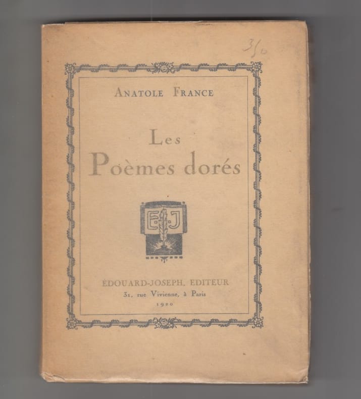 Chez Edouard-Joseph, 1920. L'un des 100 exemplaires numérotés sur papier Hollande van Gelder, celui-ci le n° 1. Large in-8 broché à grandes marges non rognées (19,5 x 18,5 cm), couverture imprimée en noir et en lettres dorées, 189 pages. ///// Anatole FRANCE (Paris 1844 - Saint-Cyr-sur-Loire 1924) était un écrivain français qui a reçu le Prix Nobel de littérature en 1921. Il fut lun des plus importants critiques littéraires et devint lune des consciences les plus significatives de son temps, sengageant en faveur de nombreuses causes sociales et politiques du début du XXe siècle. Publié en 1873, "Les poèmes dorés" est le premier recueil de poèmes d'Anatole FRANCE / - 400g. CR. - Intérieur bien frais, bon exemplaire.