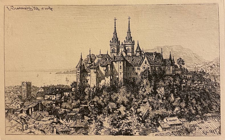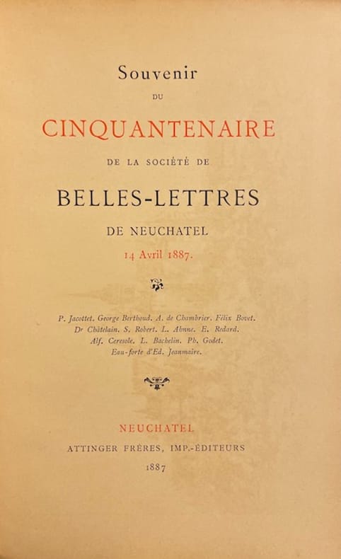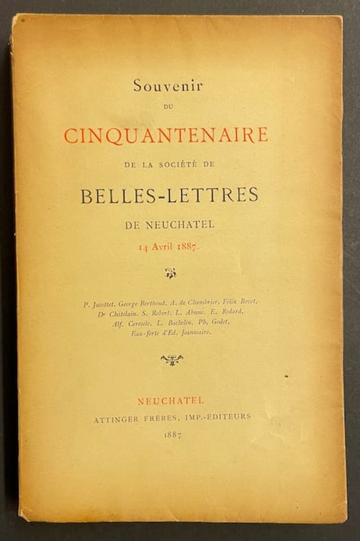 Contributions de: P. Jacottet, G. Berthoud, A. de Chambrier, F. Bovet, Dr Chatelain, S. Robert, L. Bachelin, Ph. Godet, etc... En frontispice une eau-forte d'Ed. Jeanmaire. Accroc en tête, sinon très bel exemplaire.