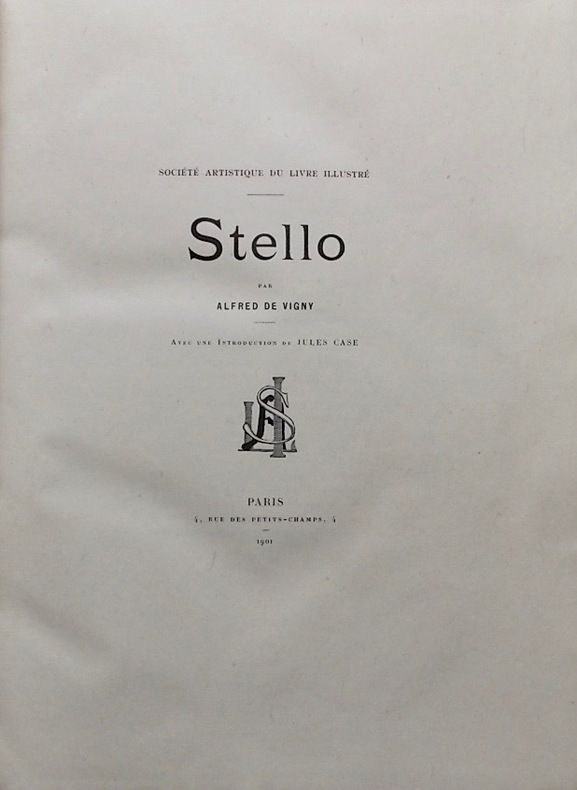 Tirage de tête : un des 25 premiers exemplaires du tirage numéroté sur Chine (seul papier). Exemplaire revêtu d'une délicate reliure du temps signée Allô. L'ouvrage est complet de ses deux eaux-fortes (chacune proposée en double-état) de Georges Jeanniot. Cette oeuvre - magistrale - met en scène l'histoire tragique de trois poètes, illustrant le conflit inévitable entre la création poétique et l'existence collective. ''Stello, un jeune homme à l'âme ardente, se sent une vocation de poète. Son ami le Docteur-Noir, qui redoute pour lui les déceptions de la vie, le traite comme un malade et entreprend de le guérir. Il lui conte l'histoire lamentable de Gilbert, puis celle de Chatterton, enfin celle d'André Chénier : ces trois poètes, l'un dans l'Etat monarchique français, le second dans l'Etat constitutionnel anglais, le dernier dans l'Etat révolutionnaire et démocratique ont été semblablement victimes d'un gouvernement qui a redouté leur génie. Stello est indigné par ces exemples ; et le Docteur Noir rédige une ordonnance où il prescrit de "séparer la vie poétique de la vie politique". Fléty, Dictionnaire des relieurs français, 10 - Vicaire I, Manuel de l'amateur de livres du XIXème, 623 (qui ne mentionne pas l'existence d'un tirage sur Chine). Angles et coiffe de tête légèrement élimés. Du reste, très belle condition.
