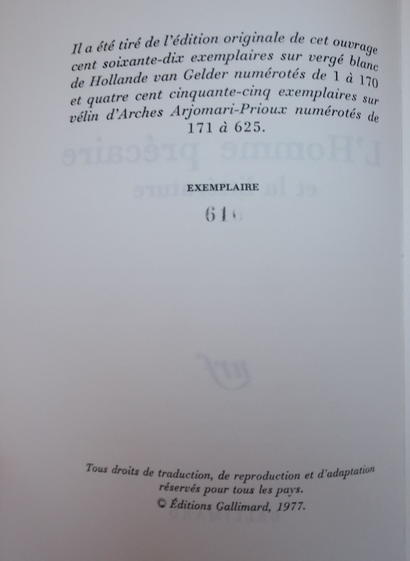 Paris Gallimard 1977 In-8, broché, couverture à rabats, non coupé. 330 pp., [3 ff.]. ÉDITION ORIGINALE. 1/170 exemplaires de tête numérotés sur vergé blanc de Hollande Van Gelder (n° 116). Le . Le dernier livre de Malraux. Le pendant pour la littérature de ce qu'est la Métamorphose des dieux pour les beaux-arts. « Avec L'Homme précaire et la littérature, Malraux acheva plus que son oeuvre, sa vie même. En le lisant, on pense aux dernières oevres des grands musiciens, aux derniers quatuors de Beethoven et de Schubert, aux dernières compositions de Bach ou de Mozart, et tout autant aux Peintures noires de Goya, aux dernières toiles de Rembrandt et de Hals. » (Michaël de Saint-Cheron).
