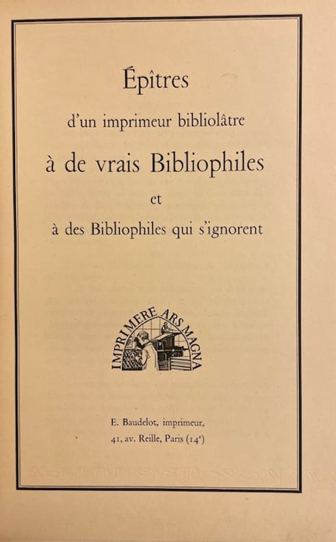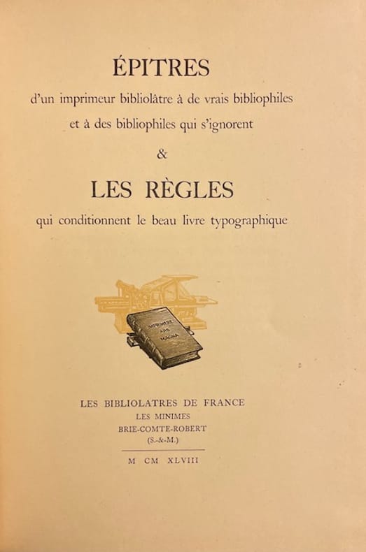 1948 Epitres d'un imprimeur bibliolâtre à de vrais bibliophiles et à des bibliophiles qui s'ignorent & les règles qui conditionnent le beau livre typographique.Les bibliolatres de France, 1948, in4° relié,111pp, couvertures conservées.Reliure passée,Une déchirure au bas de la première couverture. Intérieur en très bon état .