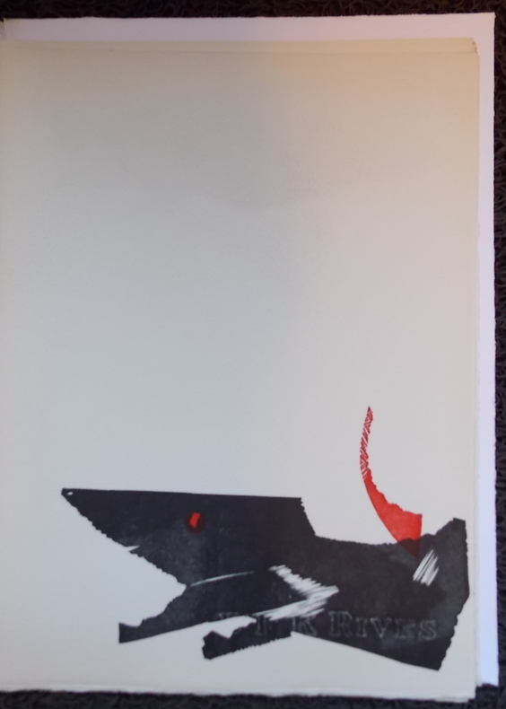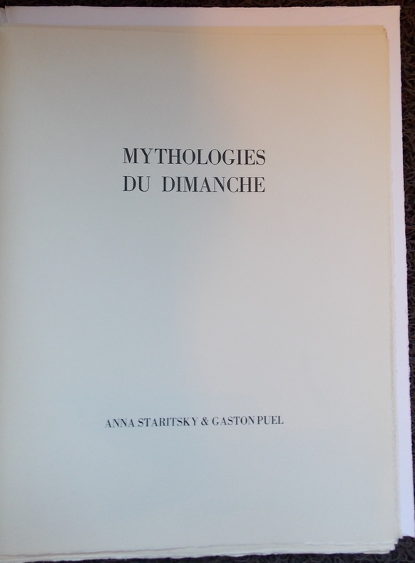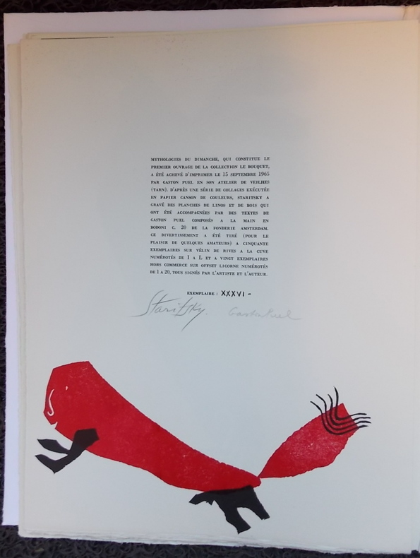 Edition originale numérotée en chiffres romains XXXVI / L exemplaires sur vélin de Rives à la cuve (seul tirage avec 20 exemplaires hors commerce sur offset licorne). Illustré de linos et de bois en couleurs d'après des collages de Anna Staritsky. Signé par l'auteur-éditeur et par l'artiste à la justification. Petits accrocs à la couverture.