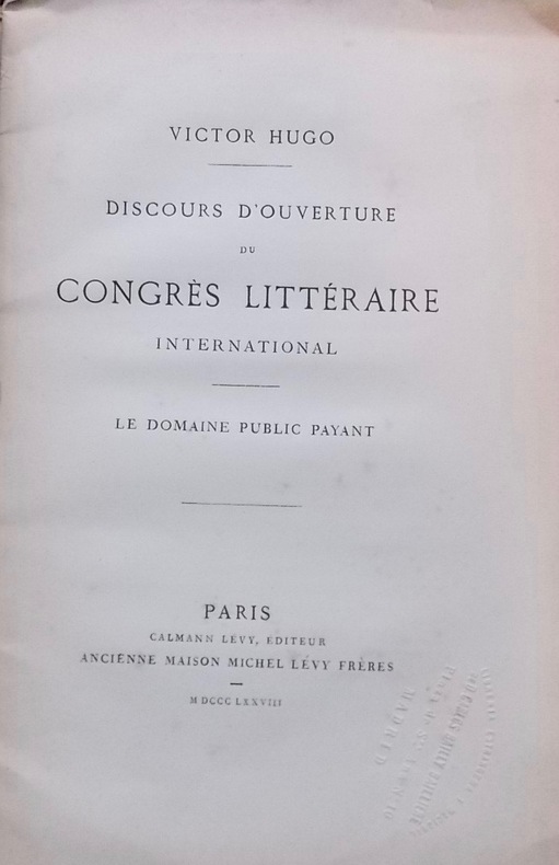 Edition originale de ce discours prononcé par Victor Hugo lors de louverture du Congrès littéraire international, le 7 juin 1878, en pleins débats sur les droits dauteurs; qui aboutiront à la convention de Berne (1886).Hugo défend le respect de la propriété littéraire dont il pose les bases mais également plaide pour une "fondation du domaine public": "loeuvre comme pensée appartient au genre humain".Auréole claire marginale.Bon exemplaire.Envoi autographe signé de Victor Hugo "A Madame Lacretelle, Hommage": Coralie Julliard (1840-1913), seconde épouse de Pierre Henri de Lacretelle (1815-1899), homme de lettres et député républicain d'extrême gauche ami de Lamartine et proche de Hugo.