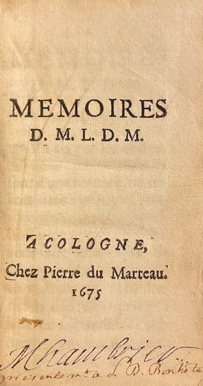 Mémoires "D[e] M[adame] L[a] D[uchesse] M[azarin]", Hortense Mancini, écrits par elle-même. D'après Babier, l'attribution à Saint-Evremond ou à l'abbé de Saint-Réal est erronée, et la "Lettre" touchant le caractère de la Duchesse de Mazarin, qui termine le volume, n'est pas de l'auteur des "Mémoires".Adresse fictive. Edition originale, en gros caractères, qui n'a pas été imprimée en Hollande [notice Rero].Manque de cuir à la reliure, sur le premier plat, en tête et en queue, noms de possesseurs en page de garde et en page de titre. Intérieur en très bonne condition.