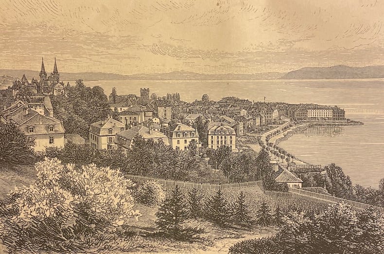 Vues à pleine page: Neuchâtel vue de l'Est / Le Château de Neuchâtel / Neuchâtel vue de l'Ouest / Palais Du Peyron / Le Nouveau Collége / Place du Marché et les Halles / L'Ancien Port / Serrières / La roche de l'ermitage / Valengin e.a.