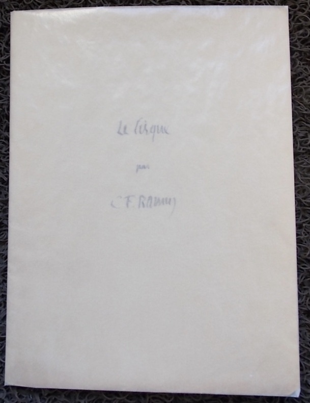 Edition originale. Un des 100 exemplaires numérotés et signés par Ramuz à la justification (N° 53). Reproduction du manuscrit original de Ramuz reproduit en phototypie par Daniel Jacomet. Manque le porte feuilles à rabats, et pâle tache rouge au dos du feuillet de justification, sinon bel exemplaire.