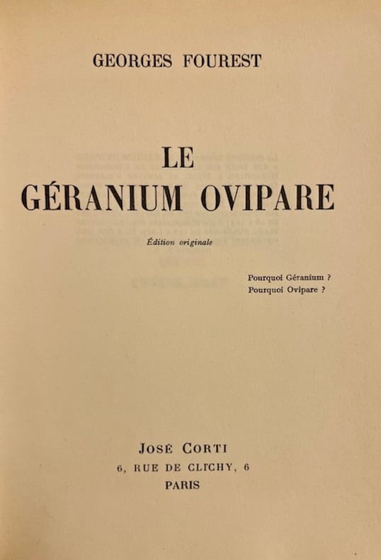 Tirage limité à 3000 exemplaires numérotés et 50 HC, le nôtre portant le numéro 326. Poésies pleines d'humour noir et de fantaisie par un maître du genre. Ne lit-on pas sous le titre : "Pourquoi Géranium? - Pourquoi Ovipare?".