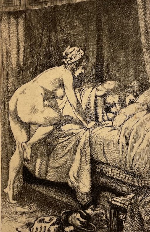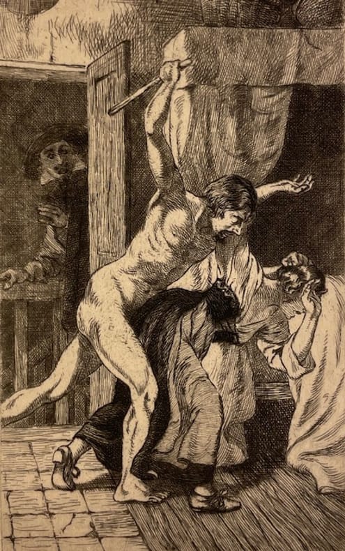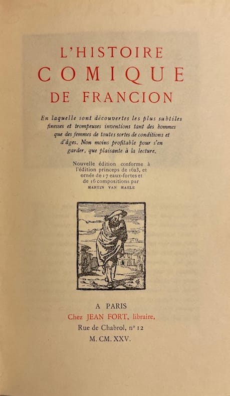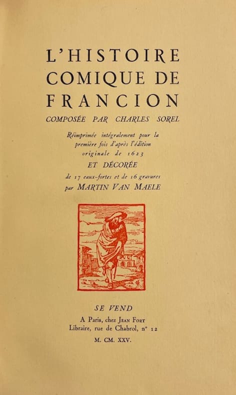 [...] en laquelle sont découvertes les plus subtiles finesses et trompeuses inventions tant des hommes que des femmes de toutes sortes de conditions et d'âges. Non moins profitable pour s'en garder, que plaisante à la lecture. Nouvelle édition, conforme à l'édition princeps de 1623, et ornée de 17 eaux-fortes et de 16 compositions par Martin Van Maele. Un des 1100 exemplaires numérotés sur papier pur fiobre de Enoshima (après 103 exemplaires numérotés sur divers papiers).En excellente condition.