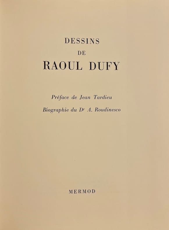Préface de Jean Tardieu. Lausanne : Mermod, 1958. Un volume broché (18,7x25,5 cm) sous couverture rempliée, 84 pages. 59 reproductions de dessins de Raoul Dufy avec les notices correspondantes in-fine. Biographie "La Vie heureuse de Raoul Dufy" par Alexandre Roudinesco. Bon état.