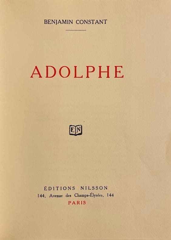 Londres, H. Colburn ; Paris, Treuttel et Wurtz, 1816 1816 In-12 (162 x 98 cm), de vii pp. dont le titre, (1) p. bl., 228 pp., veau vert, décor à froid de compartiments ornés de palmes diverses et anses au centre, dos lisse orné or sur pièces brunes et à froid sur veau vert, coupes filetées, roulettes intérieures, tranches marbrées du même motif que les gardes (reliure anglaise de l’époque). C.P. Courtney, A Bibliography of editions of the writings of Benjamin Constant to 1833, London, 1981, 18b.Édition originale française, parue vers le 15 juin 1816.Elle fut imprimée à Paris par Crapelet d’après les épreuves de l’édition originale de Londres, publiée quelques jours avant seulement, vers le 7 juin.Exemplaire du deuxième état, avec l’adresse de Londres avant celle de Paris.Ce deuxième état de l’édition parisienne fut imprimé sans l’avertissement au contrefacteur au verso du titre et sans son nom d’imprimeur en bas de page 228 ; ces deux mentions étant présentes dans l’édition de Londres et dans le premier état de l’édition de Paris.Clouzot précise que « Toutes trois sont rares et très recherchées ; celle de Londres étant quasiment introuvable. »Adolphe est un roman à part dans l'oeuvre de Constant, qui analyse la responsabilité psychologique en matière amoureuse et questionne le lecteur sur le rôle d’Adolphe dans la déliquescence de son couple avec Ellénore. En français dans le texte, 225 : « Avec Adolphe, Benjamin Constant a donné un des romans les plus beaux de la littérature française, un des plus mystérieux, des plus provocateurs qu’on ait écrits. »Bel exemplaire conservé dans une charmante reliure de facture anglaise, ornée à froid aux petits fers — cette condition est rare, Clouzot notant que cet ouvrage est “presque toujours très sobrement relié à l’époque”.------In-12 (162 x 98 cm), green calf, cold decoration of compartments decorated with various palms and handles in the center, smooth spine decorated with gold on brown and cold pieces on green calf, filleted edges, inner scrolls, marbled edges of the same pattern as the endpapers (English contemporary binding).First French edition, published around June 15, 1816. It was printed in Paris by Crapelet from the proofs of the original London edition, published only a few days before, around June 7. Copy of the second state, with the London address before the Paris one. This second state of the Paris edition was printed without the warning to the counterfeiter on the back of the title and without the printer's name at the bottom of page 228 ; these two mentions are present in the London edition and in the first state of the Paris edition. These three editions are rare. Adolphe is a novel apart from Constant's work, which analyzes the psychological responsibility in love and questions the reader on Adolphe's role in the decay of his couple with Ellénore. En français dans le texte, 225 : With Adolphe, Benjamin Constant has given us one of the most beautiful novels in French literature, one of the most mysterious and provocative that has ever been written. A fine copy preserved in a charming English binding - this condition is rare : that this work is almost always very simply bound.